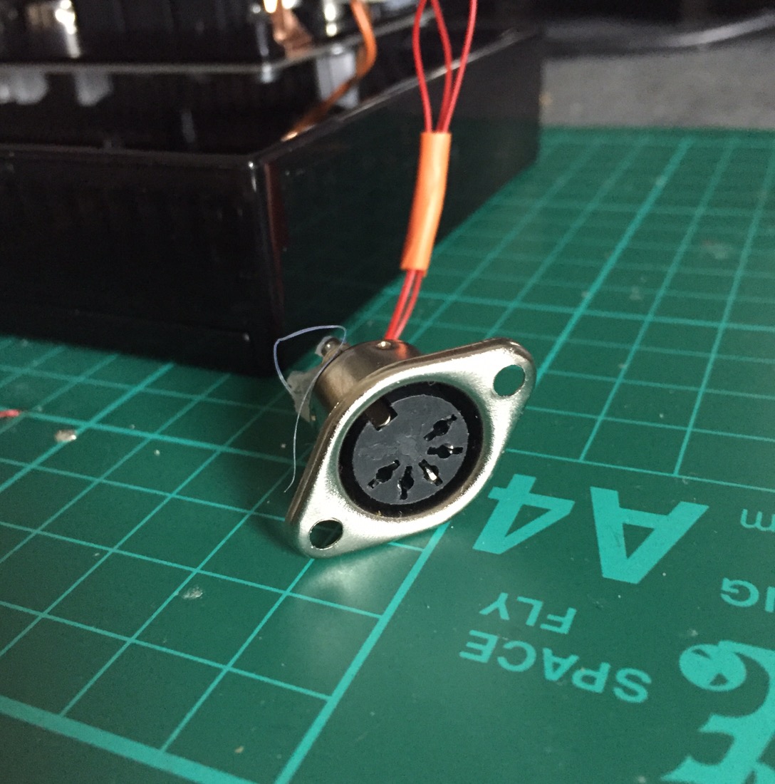 Taking inspiration from the first pioneering Game Boy modders, I decided to drill a small hole in the Volca’s case, wrap the wires in heatshrink tubing to bind them together, and then connect them up to a female DIN connector that would sit outside the Volca – minimising the need for case modification.