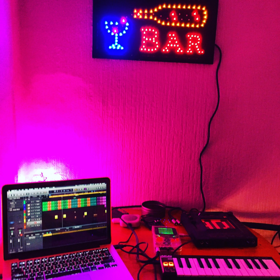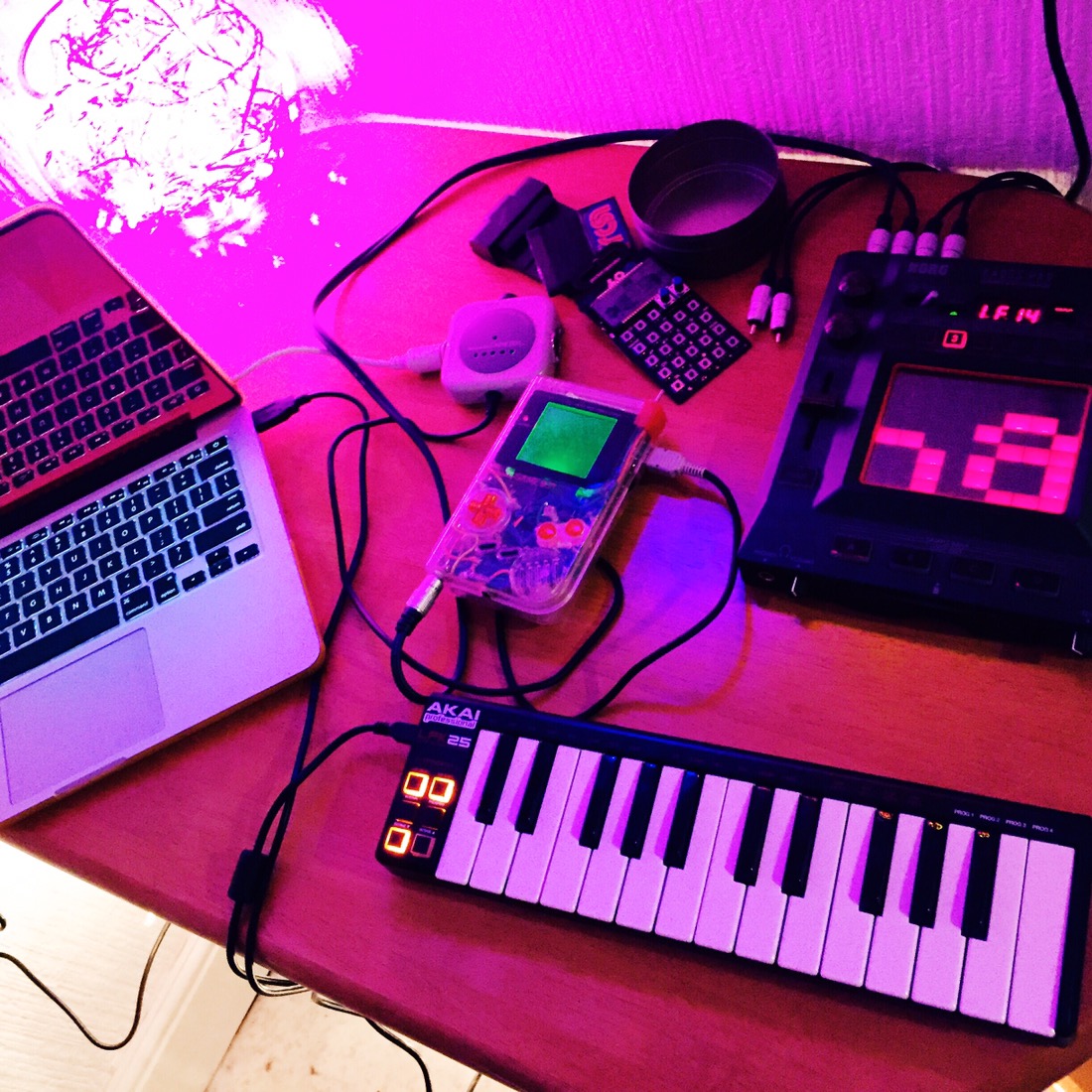 I’ve set up the Kaoss pad, along with the mixer and Gameboys – all illuminated in some bright LED lights. It’s amazing what having a decent area set aside for making music can do to your motivation.
